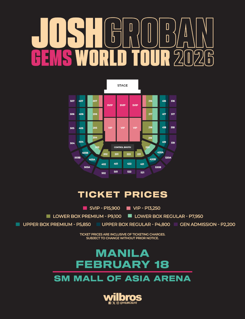 Tony, EMMY and five-time GRAMMY Award-nominated singer-songwriter Josh Groban announces his newest tour ‘GEMS WORLD TOUR’ with a concert in MANILA on February 18, 2026 at the SM Mall of Asia Arena. Presented by Wilbros Live.