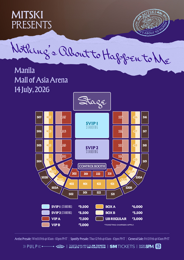Tickets will be available at SM Tickets outlets nationwide and online at smtickets.com. Fans can get early access by signing up at mitski.com/live