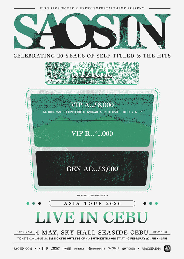 The shows – part of the SAOSIN: Celebrating 20 Years of Self-Titled & The Hits Asia Tour 2026 – will happen May 4th at the Sky Hall Seaside Cebu and on May 7th at the Skydome SM North Edsa, and both shows will share the same ticketing tiers: PHP 6,000.00 for VIP A – which includes a meet and greet group photo opportunity, an exclusive ID laminate, a signed poster and priority entry. VIP B tickets will be sold at PHP 4,000.00, while general admission tickets will be sold for PHP 3,000.00. Ticketing charges apply.
